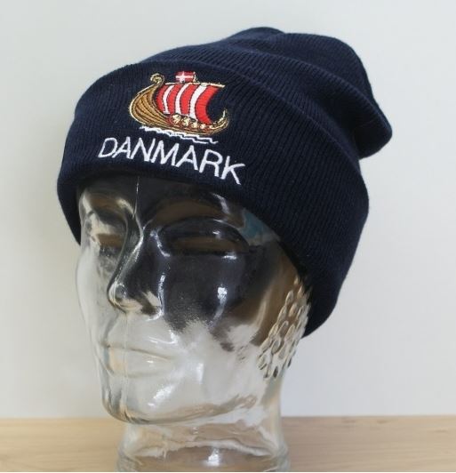 Dunkelblaue Strickmütze mit gesticktem Schiffsmotiv und dem Schriftzug 'DANMARK'.