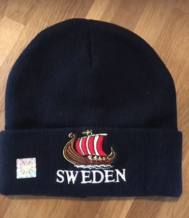 Dunkelblaue Mütze mit gesticktem Schiffsmotiv und "SWEDEN" Schriftzug.