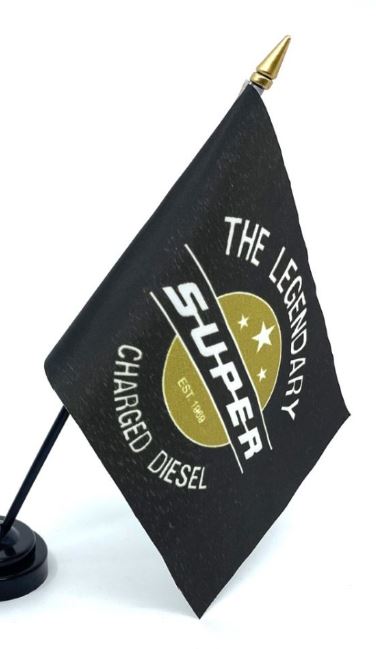Schwarze Tischflagge mit gold-weißem 'The Legendary Super Charged Diesel' Motiv, schwarzem Ständer und goldener Spitze.