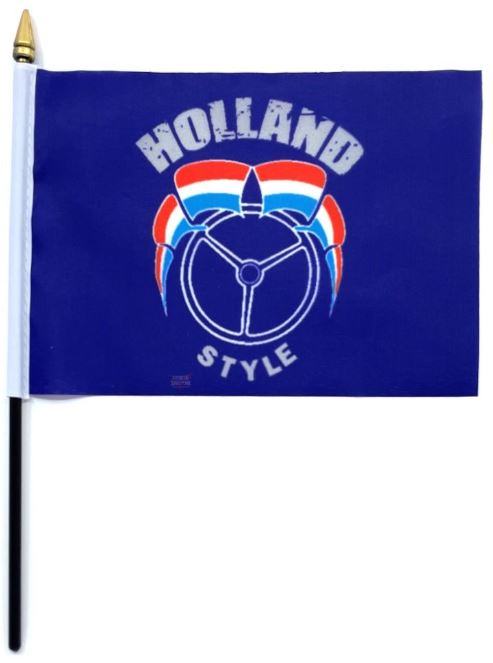 Blaue Flagge mit Holland Style Motiv, weißem Lenkrad und rot-weiß-blauen Bändern auf schwarzem Stab mit goldener Spitze.