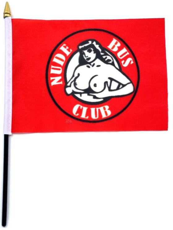 Rote Flagge mit Motiv einer nackten Frau und dem Text 'NUDE BUS CLUB' auf einem schwarzen Flaggenstab.