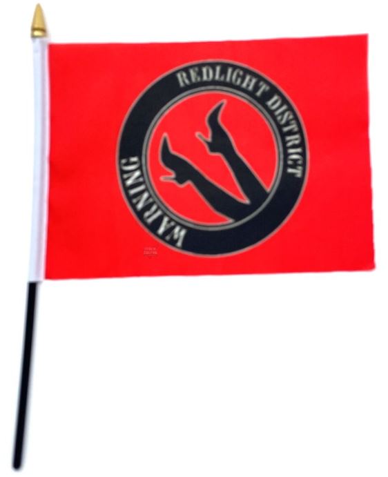 Rote Motivflagge mit schwarzem "Redlight District Warning" Logo und Beinen in High Heels am Flaggenstab.