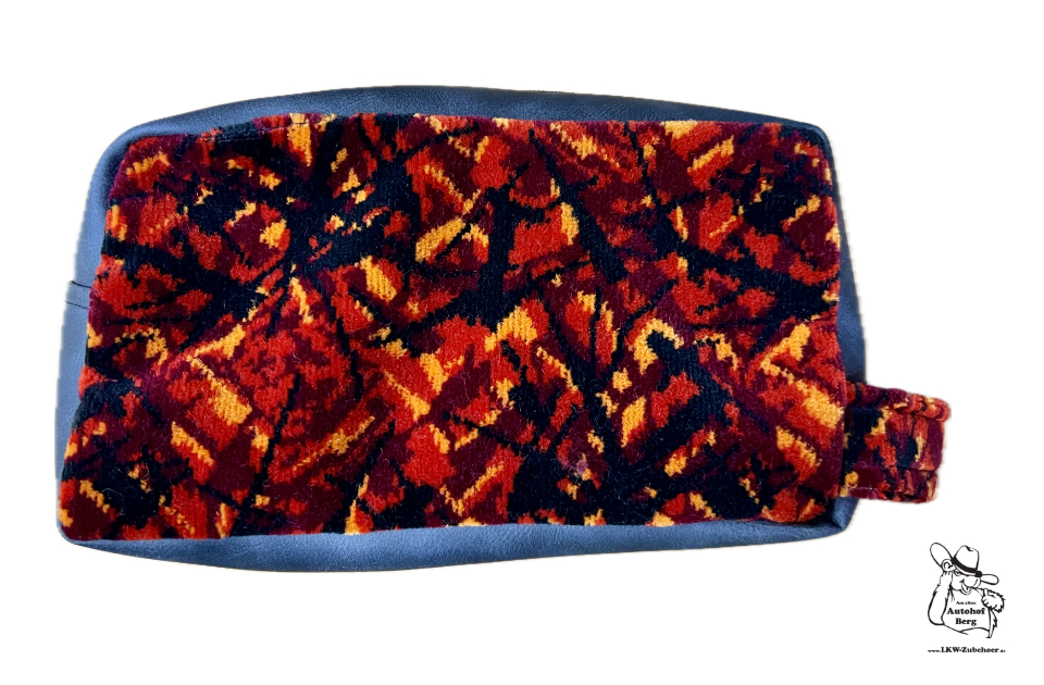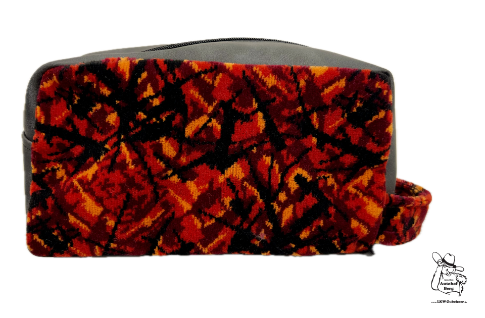 Waschtasche aus Plüsch mit rotem, orangefarbenem und schwarzem Muster, dunklen Seiten, Reißverschluss und Henkel.