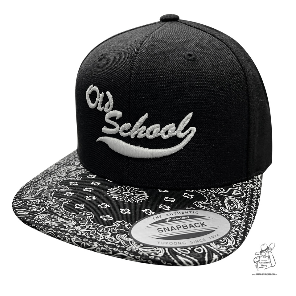 Schwarze Snapback Cap mit weißer "Old School" Stickerei und schwarz-weißem Ornamentmuster auf dem Schirm.