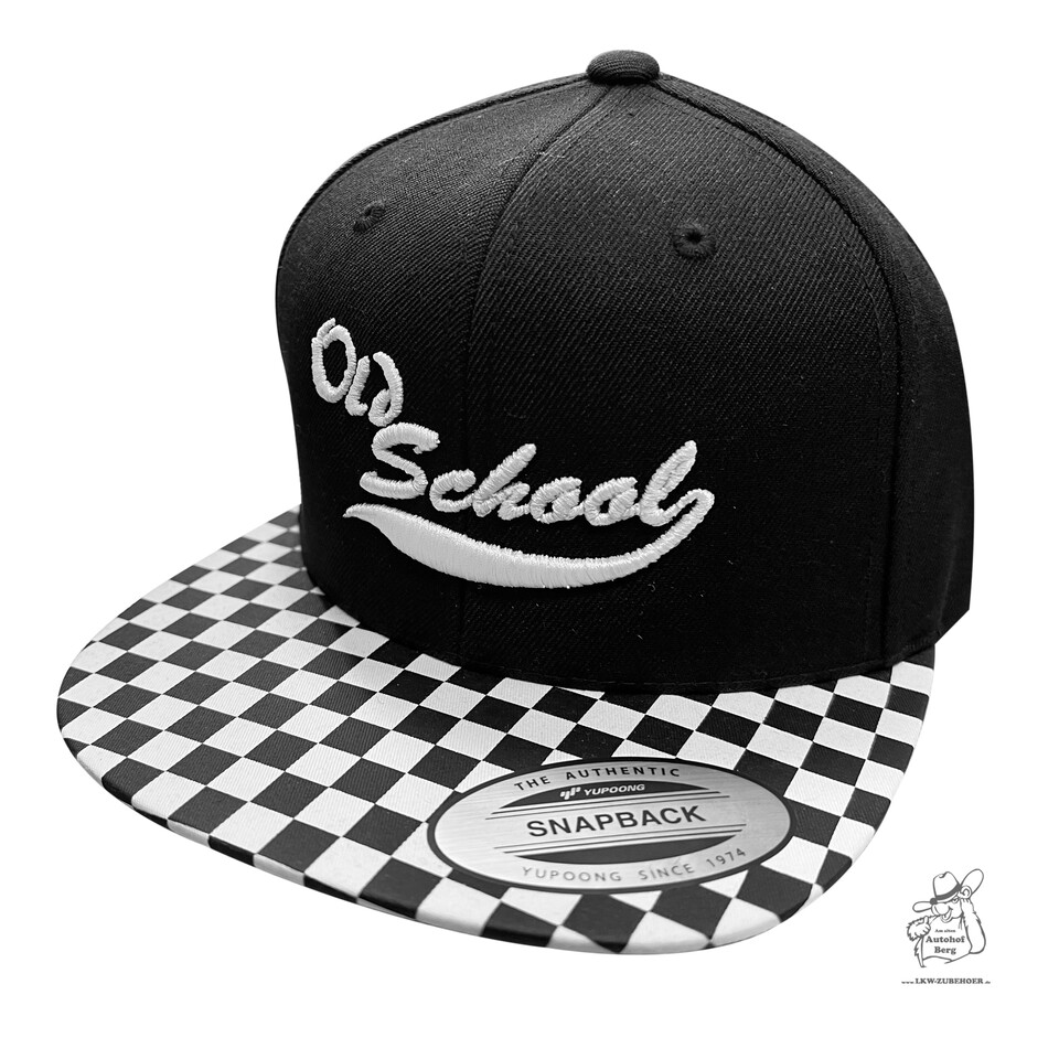 Schwarze Snapback Cap mit weißem "Old School" Stick und schwarz-weißem Schachbrett-Schirm.