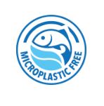 Blaues Logo mit Fisch und Wellen, umgeben vom Text 'MICROPLASTIC FREE'.
