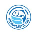 Blau-weißes "Microplastic Free" Siegel mit Fisch und Wellen.