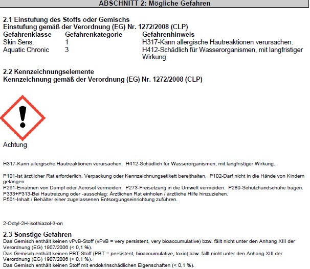 Sicherheitsdatenblatt-Ausschnitt für RefreshCockpit Care mit Gefahrensymbol und dem Hinweis