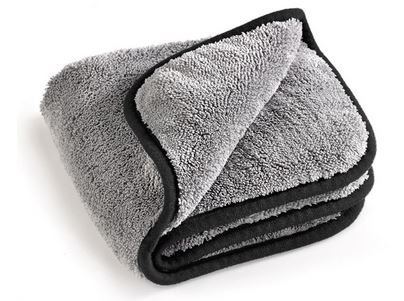 Graues, hochfloriges Mikrofasertuch mit schwarzem Saum, gefaltet.
