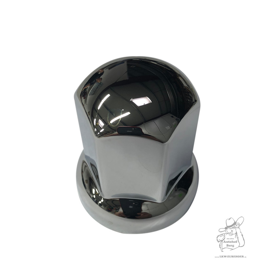 Glänzende, chromfarbene Radmutterkappe aus Kunststoff mit abgerundeter Oberseite.