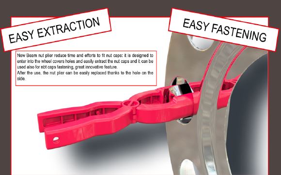 Rote Radmutternzange für BEAM Produkte, im Einsatz zum einfachen Einsetzen und Entfernen von Radmutternkappen.