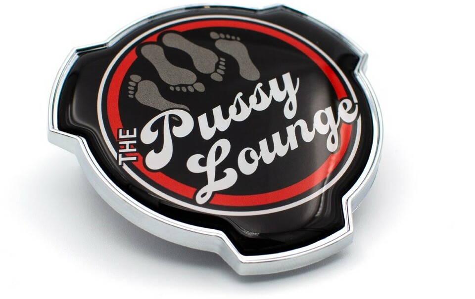 Rundes Kühleremblem aus Plastik mit silbernem Rand. Schwarzes Zentrum mit rotem Ring, weißen Fußabdrücken und "THE Pussy Lounge" Schriftzug.