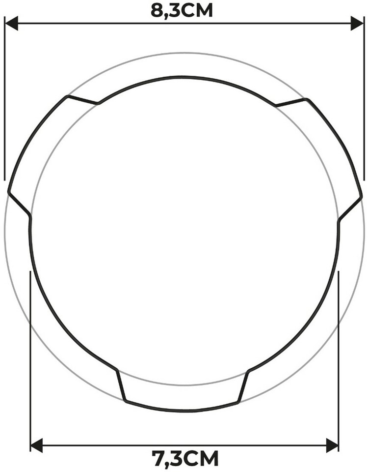 Schwarz-weißes Diagramm eines runden Kühleremblems aus Plastik mit eingezeichneten Maßen.