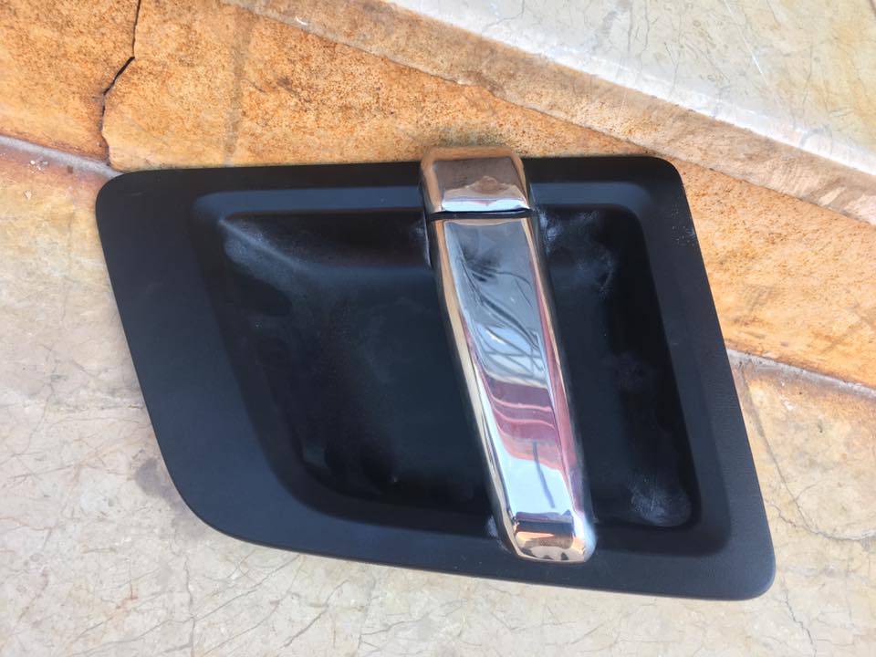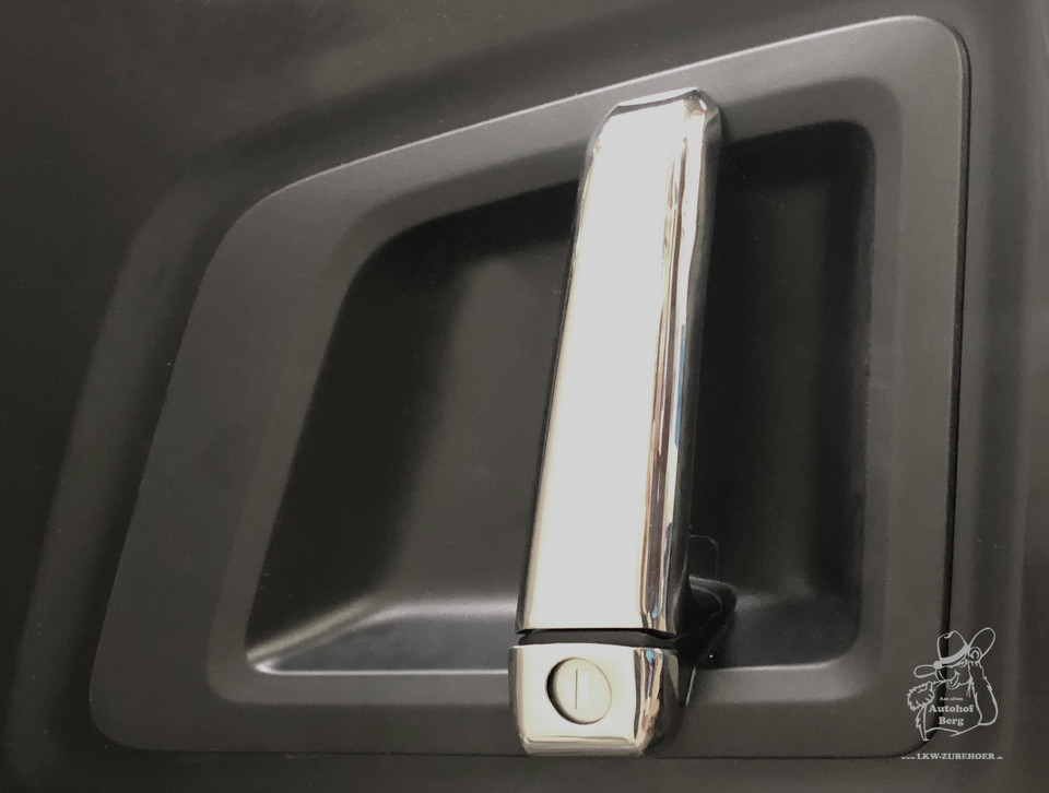 Glänzende, gepresste Edelstahl Türgriff Applikation auf einer dunklen LKW-Tür.