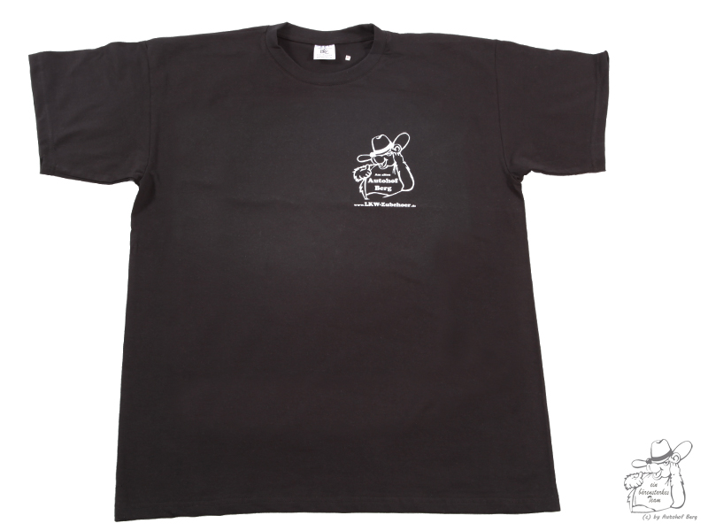 Schwarzes Autohof Berg T-Shirt aus Baumwolle mit weißem Aufdruck: Bär, 'Am alten Autohof Berg', 'www.LKW-Zubehoer.de'.