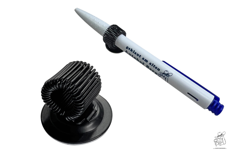 Weiß-blauer Kugelschreiber "geklaut im Autohof Berg" und schwarzer Klebeclip mit Klebebefestigung.