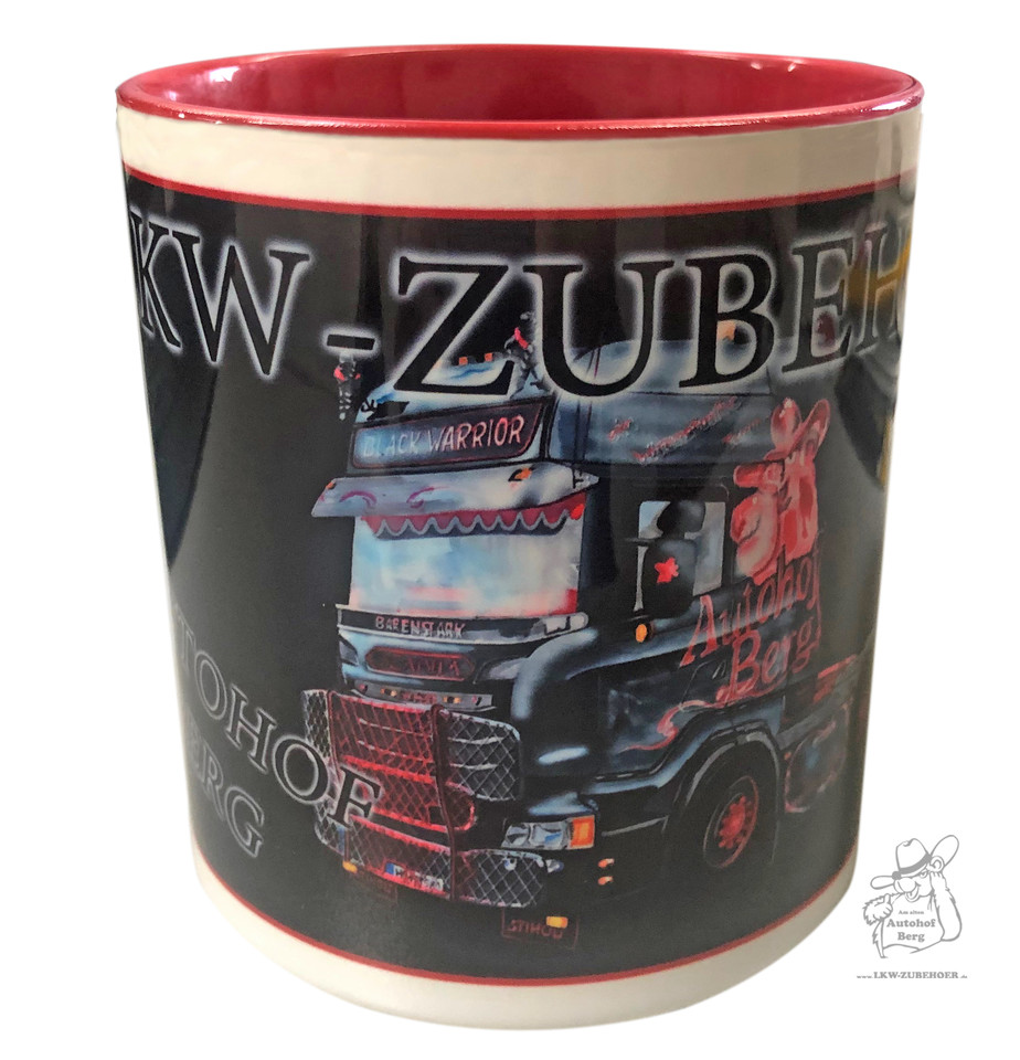 Black Warrior Paint Tasse: Schwarz mit LKW-Motiv, roter Innenseite und weißen Rändern.