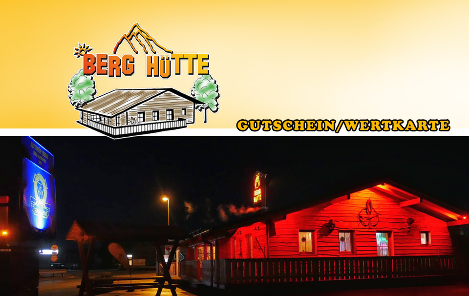 Berg Hütte Kundenkarte: Oben Logo mit Hütte und 'Gutschein/Wertkarte', unten die rot beleuchtete Holzhütte bei Nacht.