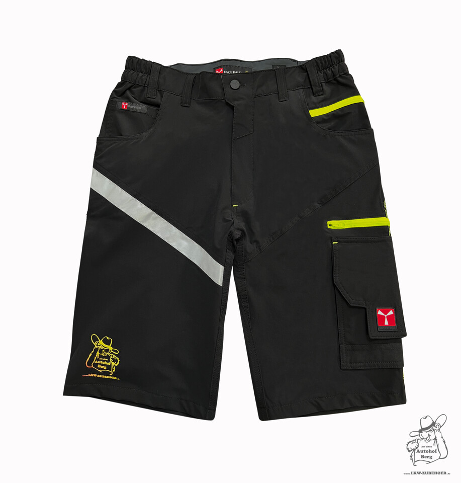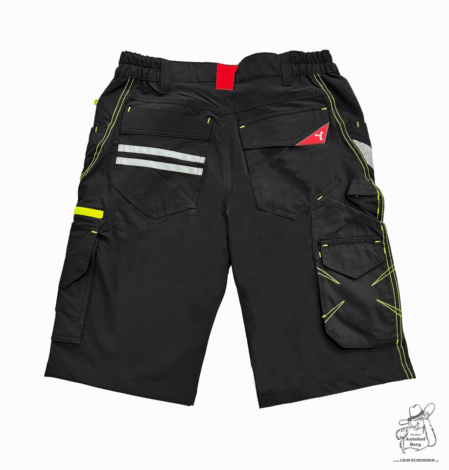 Schwarze Bermudashorts aus Stretch-Nylon, Rückansicht, mit mehreren Taschen, gelben Kontrastnähten und reflektierenden Streifen.