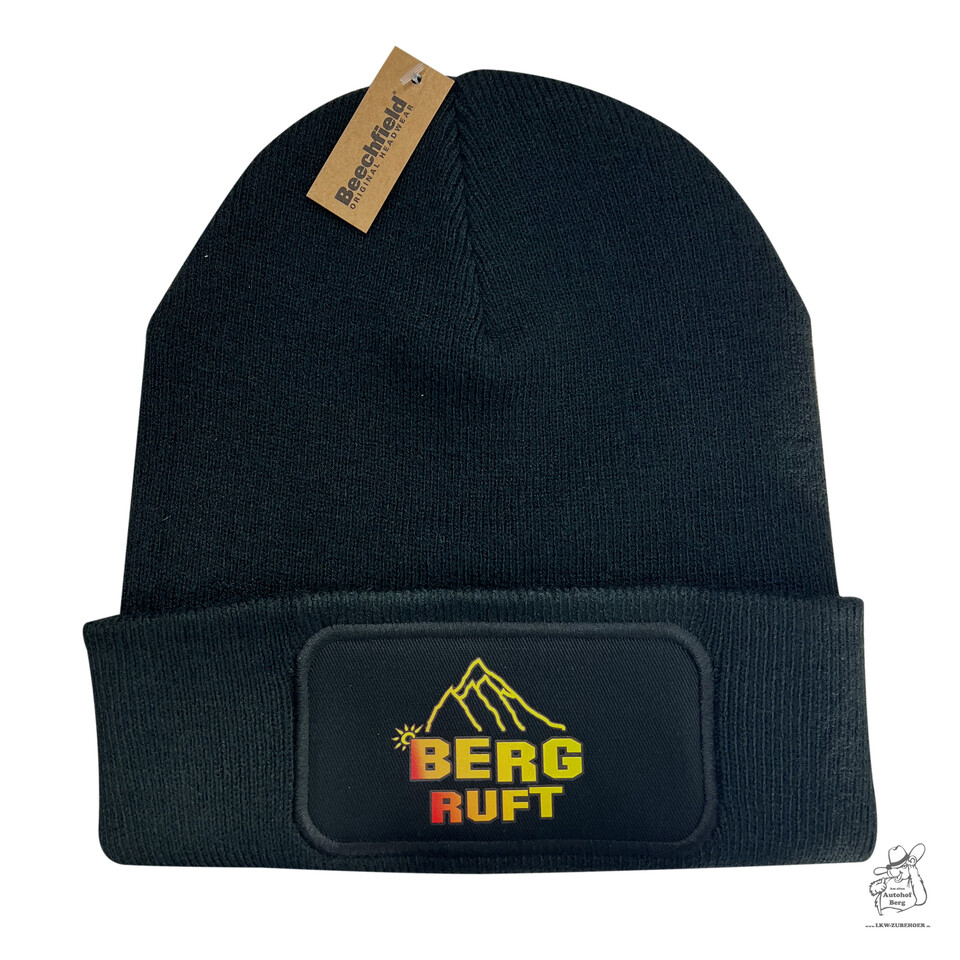 Schwarze Strick-Wintermütze mit einem Patch, der ein Bergmotiv und den Schriftzug "Berg Ruft" zeigt.