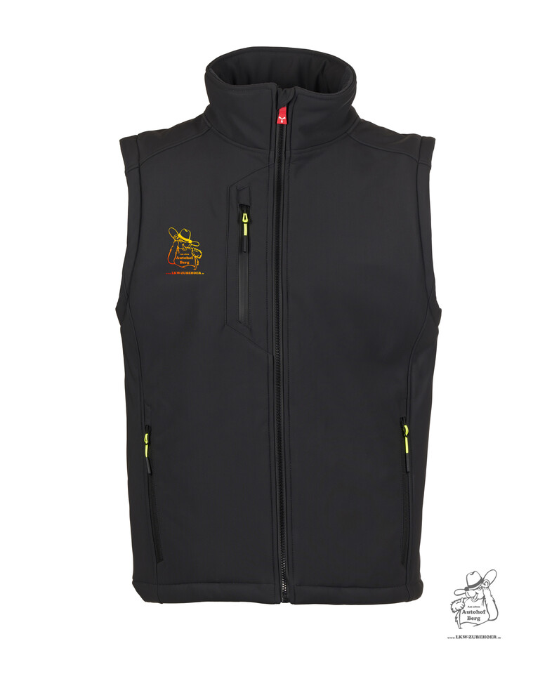Schwarze Softshell-Herrenweste mit Reißverschlüssen, fluoreszierenden Ziehhilfen und Berg Bär Aufdruck auf der Brust.