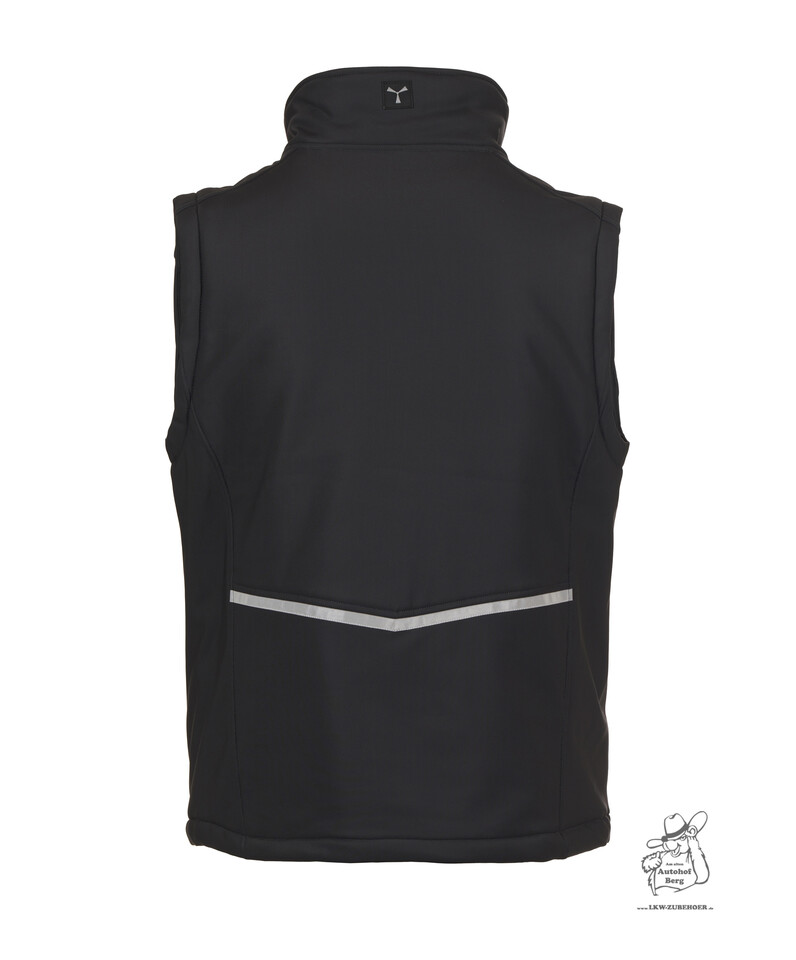 Schwarze Softshell-Herrenweste, Rückansicht, mit reflektierendem Streifen.