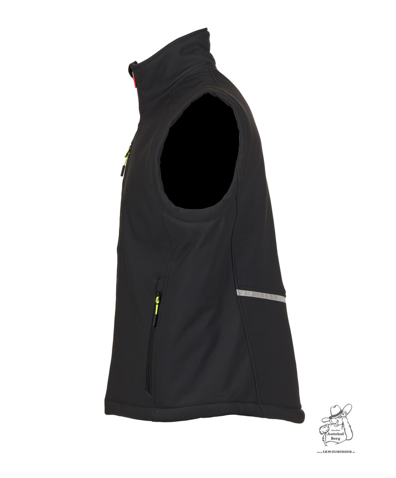 Schwarze Softshell-Herrenweste in Seitenansicht. Mit Reißverschlusstasche, gelbem Zipper und reflektierendem Streifen.