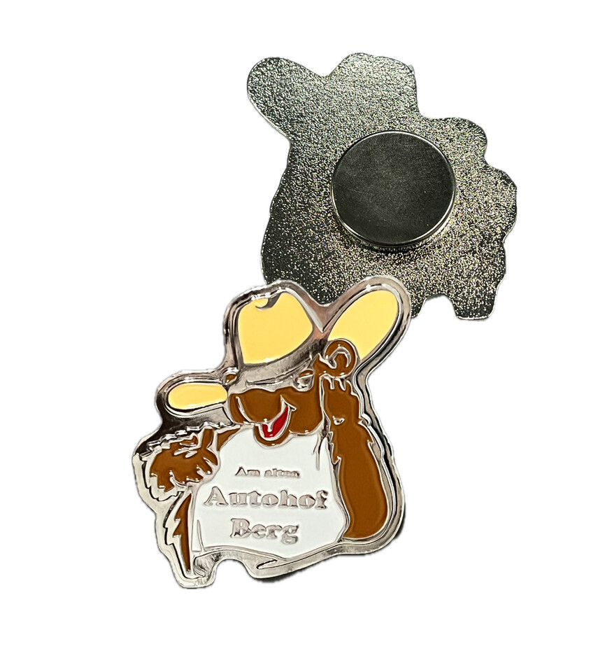 Metallmagnet in Form eines braunen Cartoon-Bären mit gelbem Cowboyhut. Auf dem weißen Shirt steht 'Am alten Autohof Berg'.