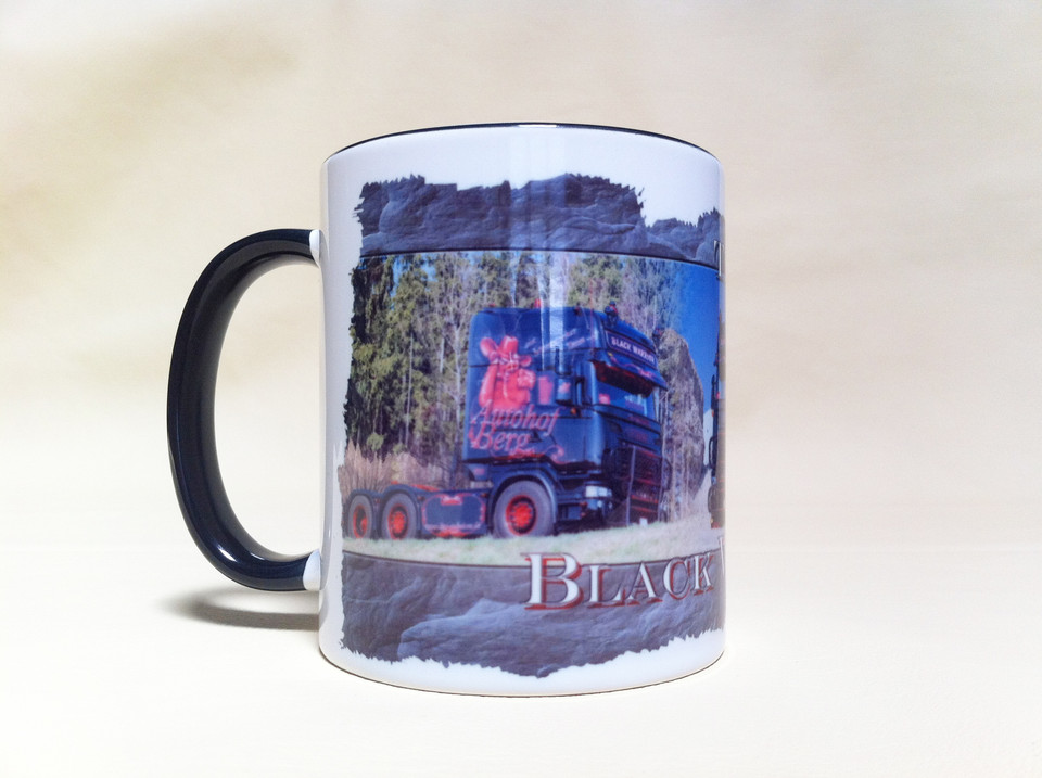 Weiße Keramiktasse mit schwarzem Henkel und Rand, bedruckt mit einem schwarzen LKW und dem Schriftzug "BLACK WARRIOR".
