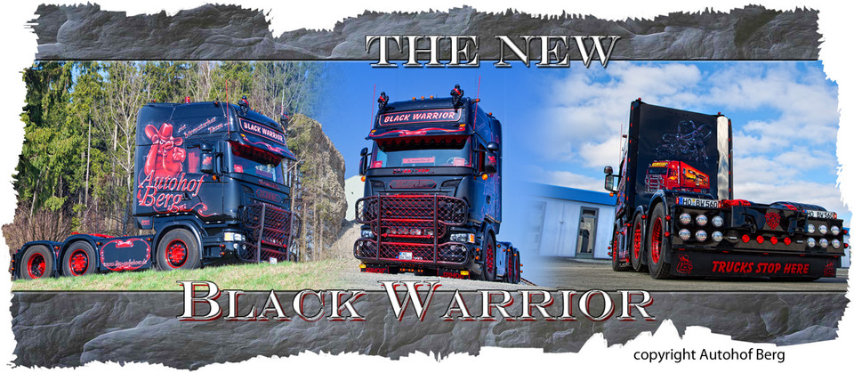 Schwarzer LKW mit roten Akzenten und 'Black Warrior' Schriftzug, das Tassenmotiv.