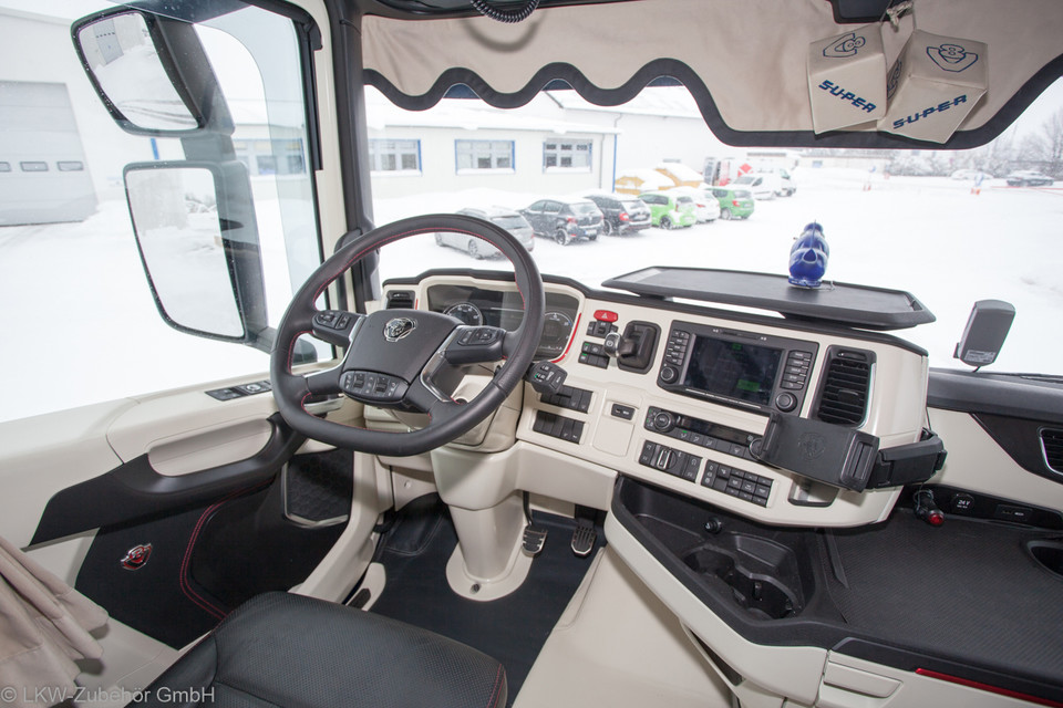 Helle Scheibenbordüre aus Polyester in Alkantara-Optik mit welliger Kante im LKW-Innenraum.