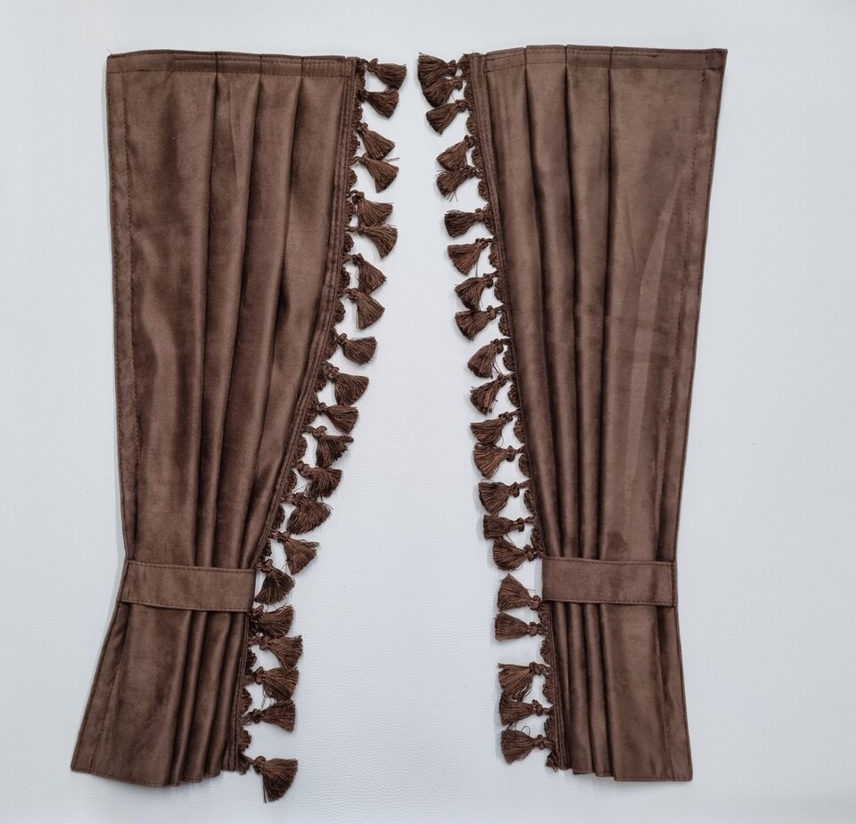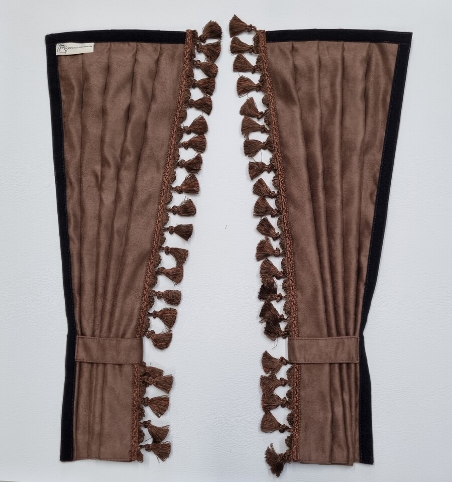 Ein Paar brauner LKW-Gardinen mit Faltenoptik, Zierquasten, Klettband und Rückhalteband.