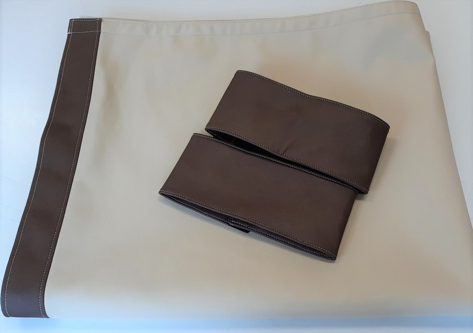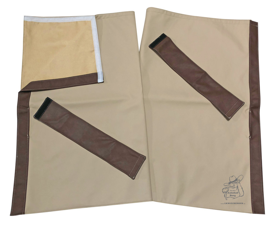 Zwei beige LKW-Gardinen aus Kunstleder mit braunen Lederoptik-Kanten und passenden Rückhaltebändern.