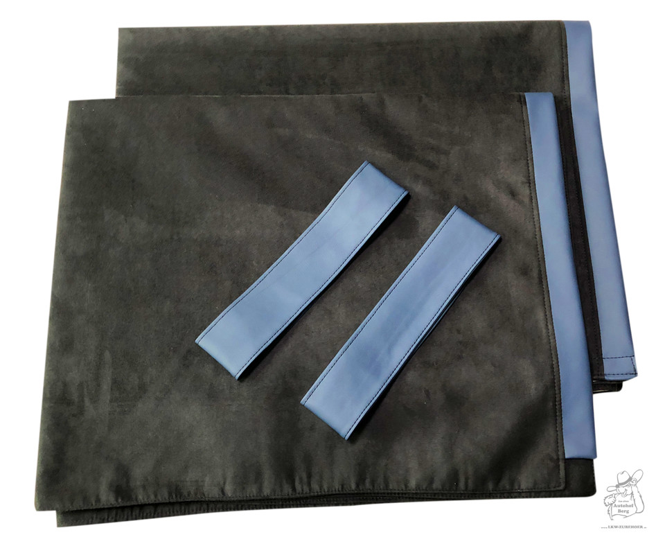 LKW-Seitengardinen aus dunklem Wildlederimitat mit blauen Lederoptik-Kanten und passenden Rückhaltebändern.