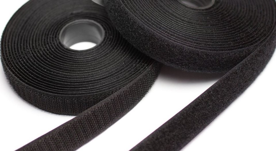 Schwarzes selbstklebendes Klettband auf Rollen, zeigt die harte Haftband- und die weiche Velourbandseite.
