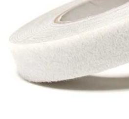 Rolle weißes, selbstklebendes Klettband (Haftband) auf braunem Kern.