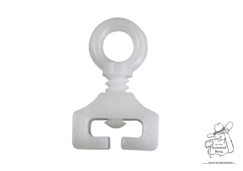 Weißer Gardinenfeststeller aus Kunststoff für T-Schienen mit Schraubgewinde.