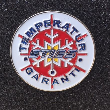 Runder Scandi Pin mit weißem Hintergrund, rotem Schneeflocken-Design und blauem Text 'TEMPERATUR GARANTI STIES'.