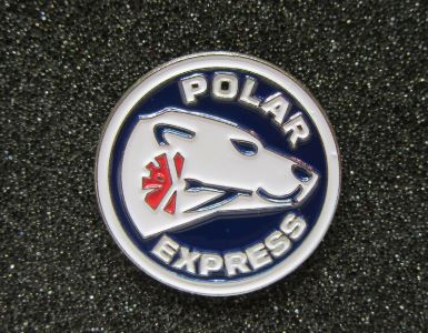 Runder Scandi Pin mit blauem Hintergrund, weißem Eisbärenkopf und rotem Symbol. Text: Polar Express.
