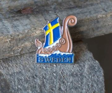 Farbiges Scandi Pin in Form eines Wikingerschiffs mit schwedischer Flagge als Segel und "SWEDEN" Schriftzug.