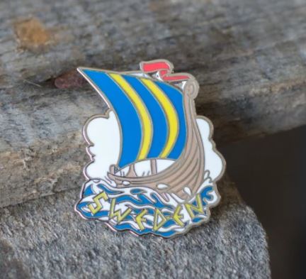 Metallpin mit braunem Wikingerschiff, blau-gelbem Segel und dem Schriftzug SWEDEN auf blauen Wellen.