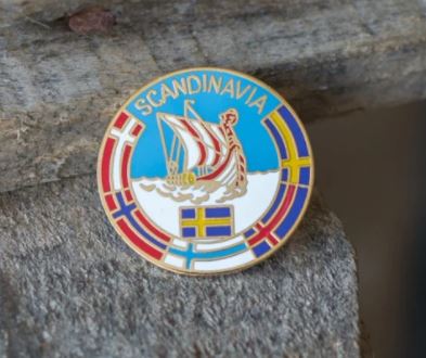 Runder Scandi Pin mit goldfarbenem Rand, zeigt ein Schiff, "SCANDINAVIA" Schriftzug und nordische Flaggen.