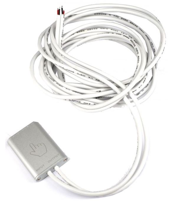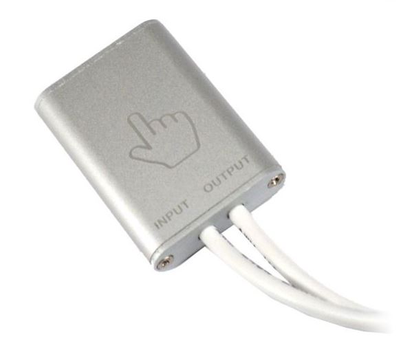 Silberner Touch-Dimmer mit Hand-Symbol, 'INPUT' und 'OUTPUT' Beschriftung und weißen Kabeln.