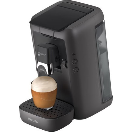 Dunkelgraue Senseo Kaffeepadmaschine Maestro mit Tasse Kaffee.
