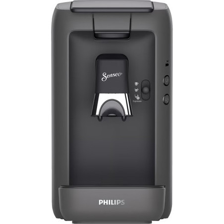 Dunkelgraue Kaffeepadmaschine Campeo Maestro von Philips mit Senseo-Logo und Bedienfeld.