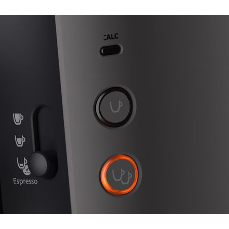 Dunkelgraue Kaffeepadmaschine Campeo Maestro: Bedienelemente mit Schieberegler für Kaffeemenge und beleuchteten Tasten.