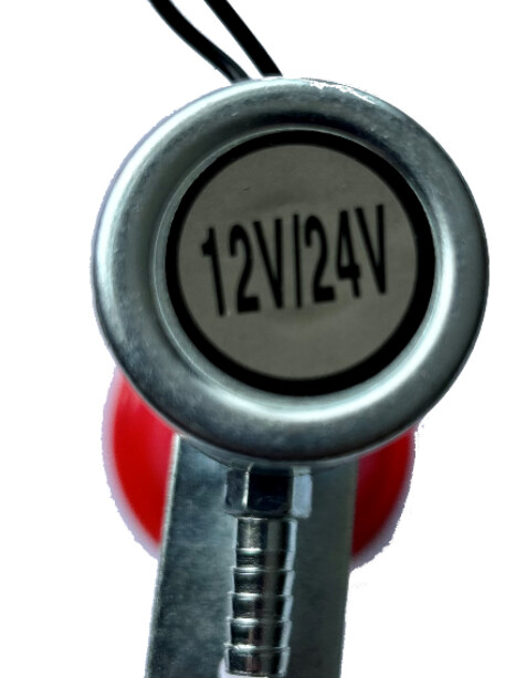 Vorderansicht einer silbernen Türkish Whistle mit klar lesbarer 12V/24V Aufschrift.