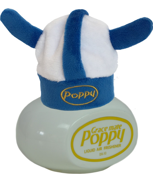 Weiße und blaue Plüsch-Wikingermütze mit Poppy-Schriftzug auf einem Poppy Lufterfrischer.