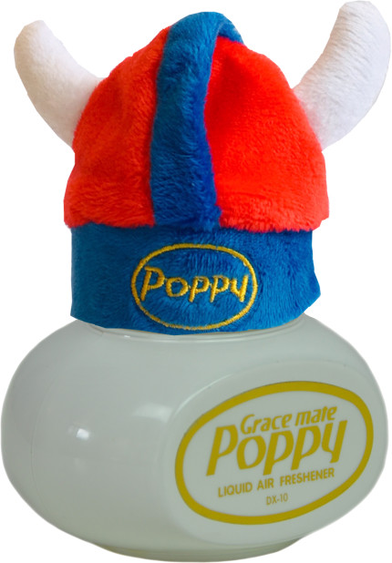 Rote und blaue Plüsch-Mütze im Wikinger-Stil mit Hörnern, auf einem weißen Poppy Lufterfrischer. Aufschrift: Grace mate Poppy.
