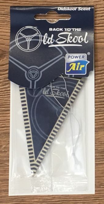 Verpackter Scandi Lufterfrischer 'Back to Old Skool' in Blau, dreieckig mit Lenkrad-Design und Streifen.